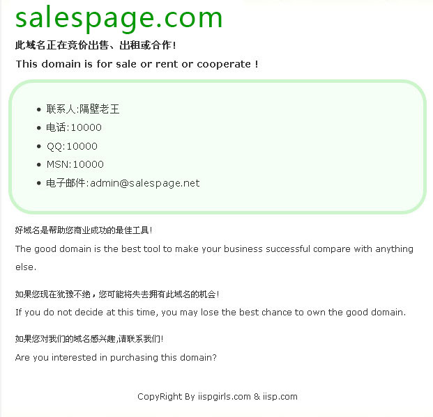 域名注册成功后,不买空间就可以有一个免费的域名展示页面,在该页面中,可以设置您的个人信息,如:姓名,电话,QQ,邮件等信息,当用户或者搜索引擎可以直接访问您的域名,就可以看到您的域名展示页面。